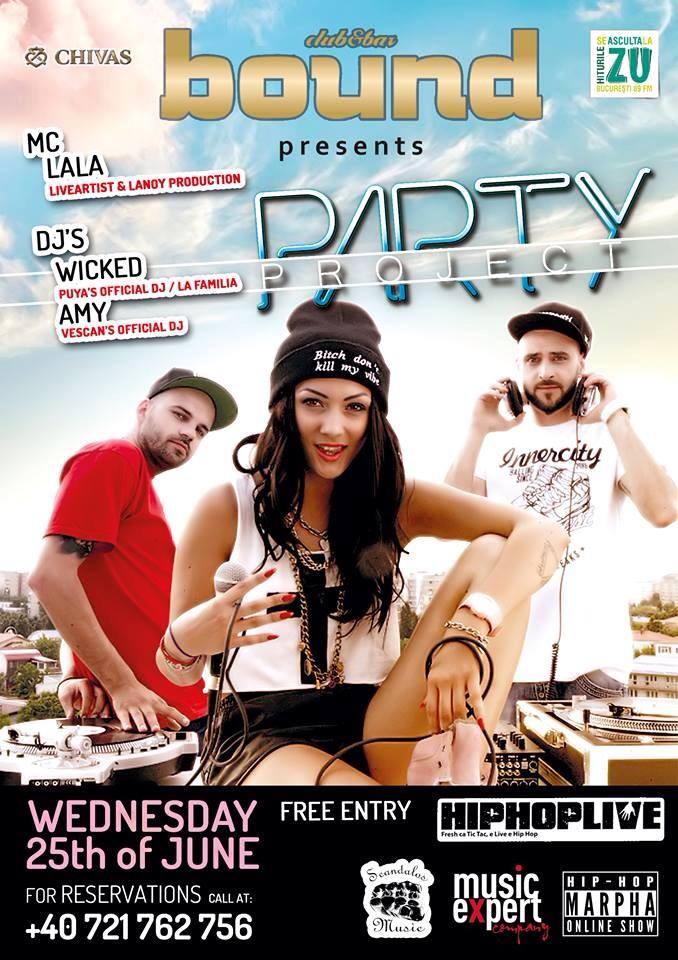 PARTY PROJECT a fost creat din nevoia de a aduce un nou vibe petrecerilor din club si de a reinventa conceptul de distractie nebuna. Toata lumea care cauta distractie apreciaza un dj bun. Cand in pupitru se intalnesc 2 dj urbani consacrati si o voce de exceptie, rezultatul nu poate sa fie decat unul genial. Dj Amy si Dj Wicked sunt poate cei mai in masura dj sa duca conceptul de URBAN party la un alt nivel, ei fiind dj-ii lui Vescan si Puya. Cand adaugi un MC sexy si talentat / MC LALA, platane si scratch-uri pe beat-uri de trap, raggae, hip-hop si R’N’B ai obtinut singurul concept din Romania care iti garanteaza o seara bestiala.