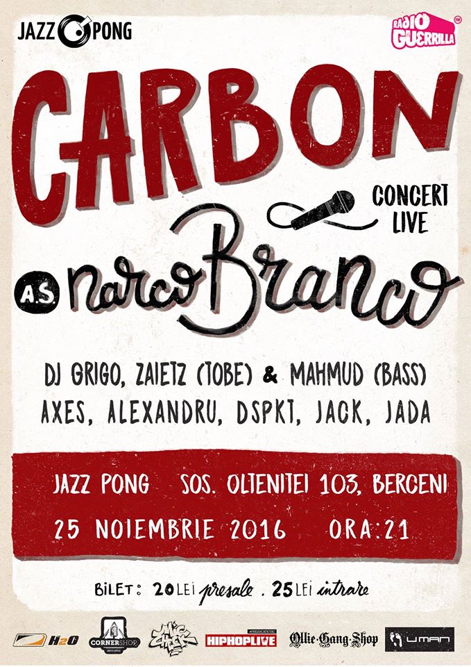 Carbon a.s. NarcoBranco & LiveBand & Invitatii. -Vineri 25 noiembrie, ora 21 - Club JAZZ PONG - Bilete: Pre-sale 20 Lei La Intrare 25 Lei Voi urca pe scena alaturi…