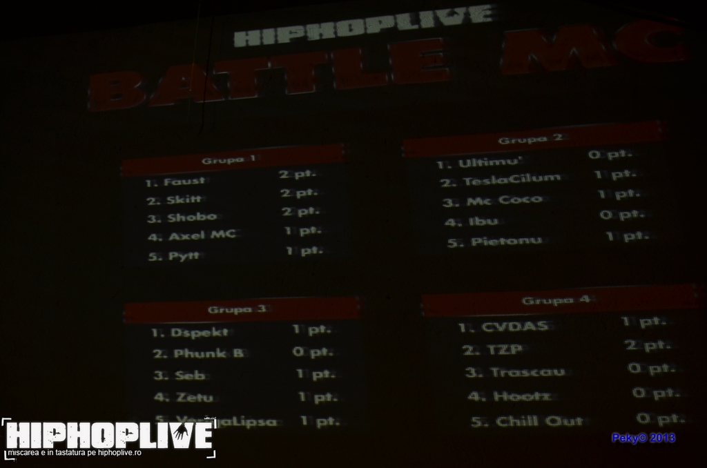 Juriul a decis ca fiecare dintre cei doi să primească câte un punct. Următorul meci al primei grupe a fost între Skitt şi Ax3l MC, Skitt obţinând punctul. Campionul de anul trecut, Pytt, a stat pe bară în prima etapă. Ajung în Grupa B, primul meci a fost între Ultimu MC şi MC Coco, MC Coco obţinând victoria. Cum Ibu ( cel ce l-a înlocuit pe Goro ) nu a fost prezent, TeslaCilum a obţinut punctul. Trecând mai departe în Grupa C, Dspekt l-a învins pe Seb. Phunk B a lipsit de la acest eveniment, iar Zetu a obţinut punctul.