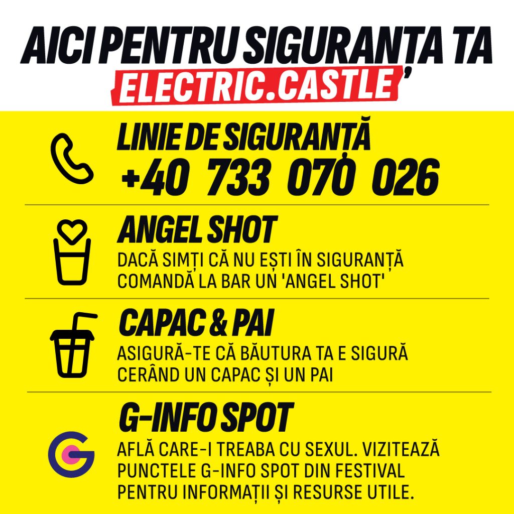Peste 1.500 de oameni se vor ocupa de siguranța participanților, echipe proprii ale festivalului și ale autorităților. Electric Castle are propriul număr de urgență 0733 070 026 disponibil non stop și 3 puncte de prim-ajutor. Rămâne în vigoare și codul “Angel shot” ce poate fi folosit la orice bar pentru a primi ajutor. Pentru prima dată, în festival pot fi accesate punctele G-Info Spot unde sunt puse la dispoziție informații și resurse pentru siguranță sexuală. MedLife oferă gratuit posibilitatea de testare BTS iar medicii specialiști ginecologi, urologi, psihologi și psihiatrii sunt prezenți, în festival, pentru consiliere, în baza unui program prestabilit.